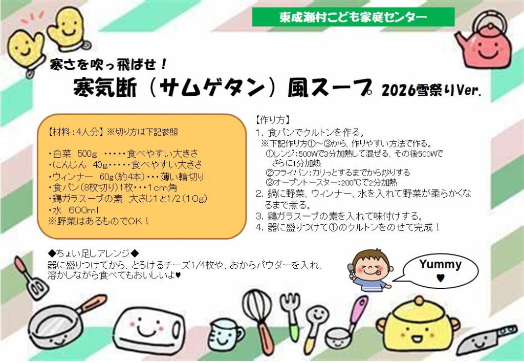なるせ保育園ゆきまつりで、こども家庭センターがふるまったスープのレシピを掲載します。
