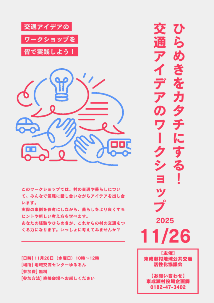 村ではいま、バスや乗り合いタクシーなどの「みんなの移動手段」を、もっと使いやすくするための計画策定を進めています。今回、計画へさらに皆さんの声を反映すべく、皆さんと一緒に「どんなサービスがあれば暮らしやすいか」を考えるワークショップを開くことになりました。