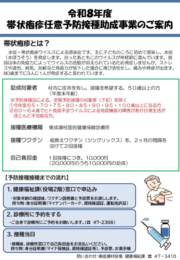 村では、50歳以上の方が帯状疱疹ワクチンを任意接種する場合の費用を助成しています。接種希望する方は、下記案内をご確認ください。